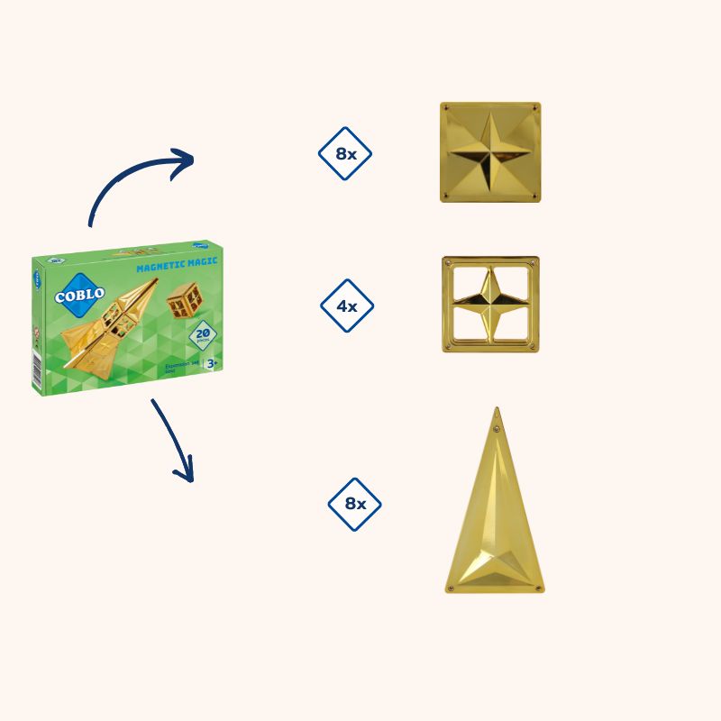 Deze bouwset bestaat uit 20 gouden magnetische bouwblokken in verschillende vormen. Door de magneetjes in de stenen, klikken kinderen deze makkelijk zelf aan elkaar. Goud goud goud waar ieder kind van houdt. Met deze supertoffe stenen maken kinderen de mooiste creaties, zoals een gouden kadootje of een paleis met gouden torens.