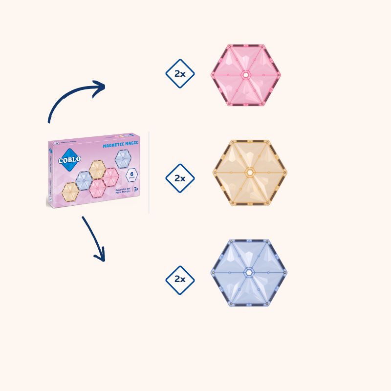 Deze uitbreidingsset bestaat uit 6 magnetische zeshoeken in verschillende pastelkleuren, te combineren met de basissets pastel. Door de magneten in de stenen kunnen kinderen deze makkelijk zelf aan elkaar klikken en nog gavere bouwwerken maken. Deze uitbreiding zorgt voor nog meer plezier.